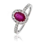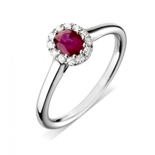 An oval ruby & diamond ring. Set with small round diamonds in a halo around the central ruby. Perfect as a gift
