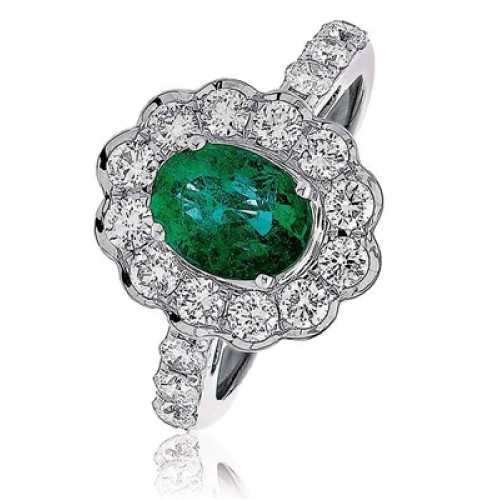Oval shaped emerald and diamond engagement ring set with a halo of round brilliant cut diamonds.