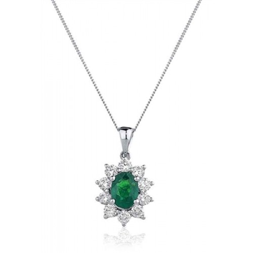 Oval shaped emerald and diamond cluster pendant set with a halo of round brilliant cut diamonds.