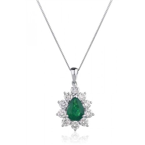 Oval shaped emerald and diamond cluster pendant set with a halo of round brilliant cut diamonds.