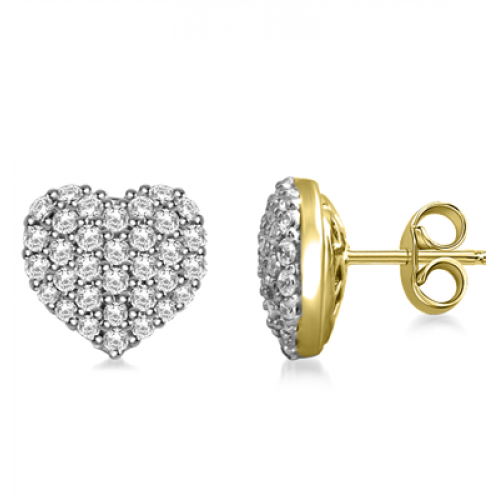 Stud earrings in a heart design adorned with round pave set diamonds. The earrings are secured with push backs.