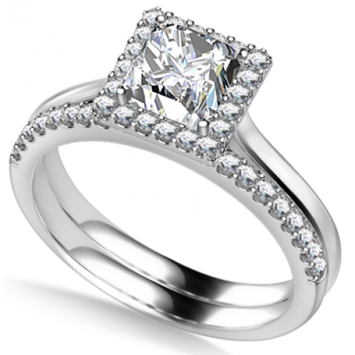 A glittering halo of floating diamonds surrounds the icy brilliance of an asscher cut diamond in this expertly crafted engagement ring. The cathedral setting has an air of timeless elegance while the brightly polished surface provides an enduring shine.