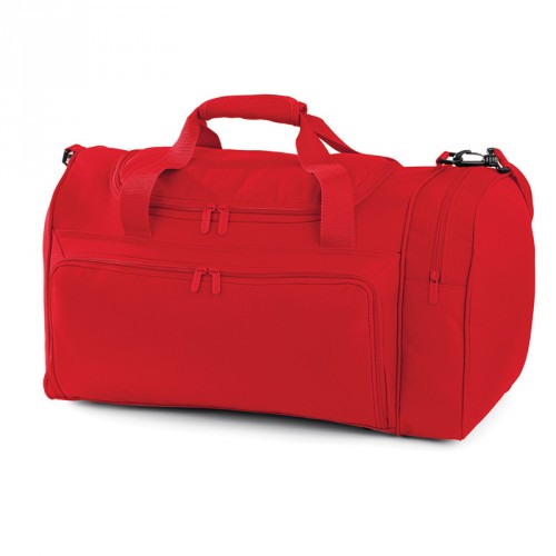 Detachable adjustable webbing shoulder strap with pad. Zippered end pocket. Zippered front pocket. Protective base feet.