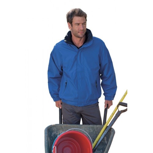Waterproof Hydrafort polyester fabric. Windproof fabric. Anti-pill symmetry fleece reverse with taped seams. Concealed hood. Studded stormflap and elasticated cuffs. 2 zipeed lower pockets with press studs at hem for embroidery access.