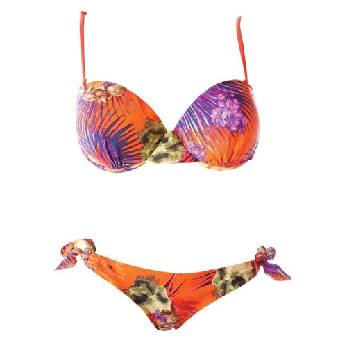 Orange bikini set featuring an all over tropical Reina Muerte print. The briefs are finished with ties on either side. The top has fully adjustable straps, moulded bra cups and ties at the back. 82% Polyamide 18% Spandex Hand wash only