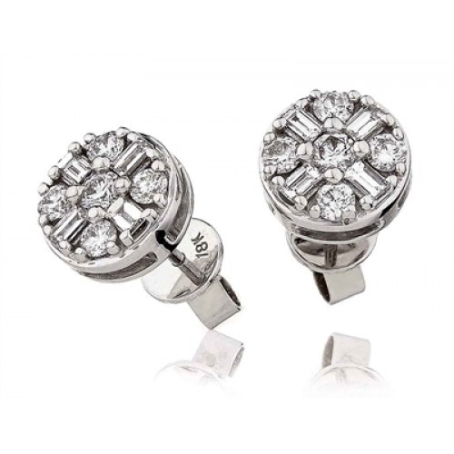 A beautiful pair of diamond cluster earrings, consisting of round and baguette cut diamonds.
