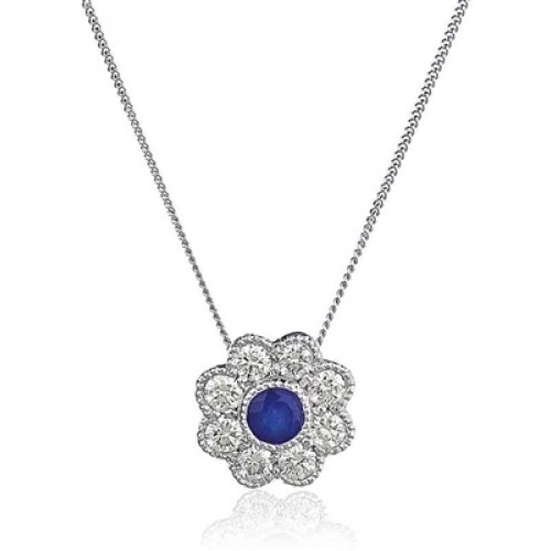 A classic gemstone diamond pendant. With a stunning round shaped blue sapphire in the centre and prong set round brilliant cut diamonds. Mounted on a highly polished single bale.