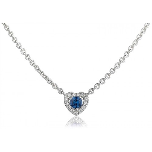 A classic gemstone diamond pendant. With a stunning round shaped blue sapphire in the centre and prong set round brilliant cut diamonds. Mounted on a highly polished single bale.