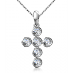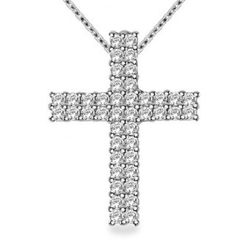 A modern diamond set cross pendant, with round diamonds set in a prong setting.