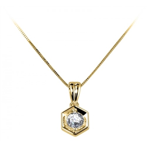 A beautiful round diamond solitaire pendant, set in a hexagon shaped setting.