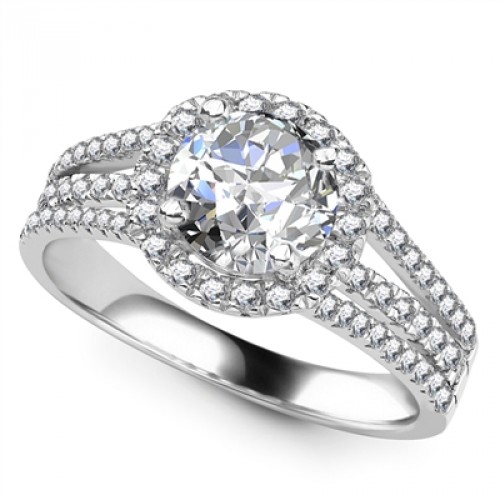 A gorgeous round diamond halo ring with round brilliant cut diamonds placed within three rows of the shoulders.