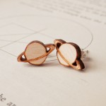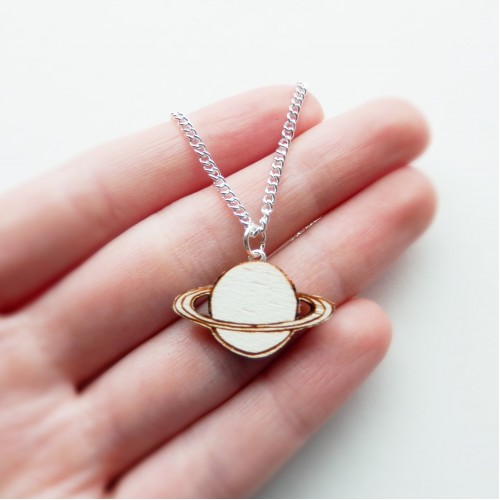 A tiny hand made saturn pendant on a silver plated chain. The saturn design has been hand drawn and engraved onto plywood using a laser cutter.