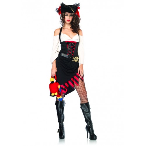 2PC.Saucy Wench, includes layered peasant top dress with waist cincher lace up detail, asymmetrical zig zag skirt and belt with skull buckle ,