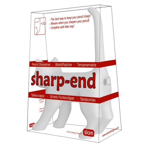 Well, what to say about the Sharp-End...um... Well, its a cat shaped pencil sharpener that lets out a "meow" when you put a pencil up its bum. Well wouldn't you? The Sharp-End comes in two colours, black and white and is packaged in a clear acetate box. It also comes complete with a litter tray to collect the shavings in - so unlike the real thing, leaves no mess.