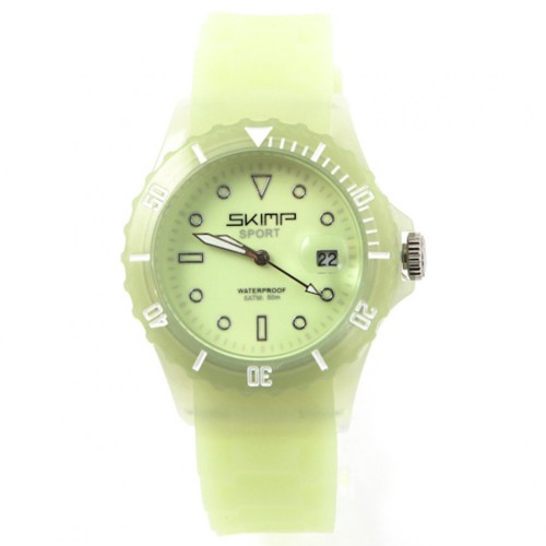 The Charmeuse watch by Skimp is the latest in trend with the silicon strap in bright colours. This specific model is flourescent and glows in the dark. It will rival any ICE watch. This 38mm diameter case watch made from stainless steel and polycarbonate, has Japanese quartz movement which ensures accurate time keeping and is water resistant to 10 ATM. The date display has a magnifying glass for ease of reading. The watch has a rotating bezel for time keeping. The watch comes in a range of colours to suite every occassion. The watch comes with a full Skimp manufacturer's guarantee. Fluorescent Glow in the dark Japanese quartz movement Water resistant to 10 ATM Case diameter 38mm (Small) in stainless steel and polycarbonate Date display with magnifying glass Silicon rubber strap Rotation bezel Luminescent hours and hands Clasp - traditional buckle Manufacturer's guarantee