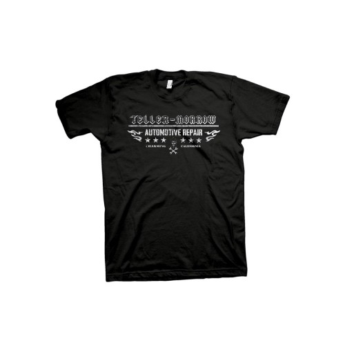 Regular fitting charcoal black t shirt featuring a large Sons of Anarchy Teller Morrow Automotive repair print. This is unisex and looks great on guys and girls. • 100% cotton. • Machine Washable at 30 degrees.