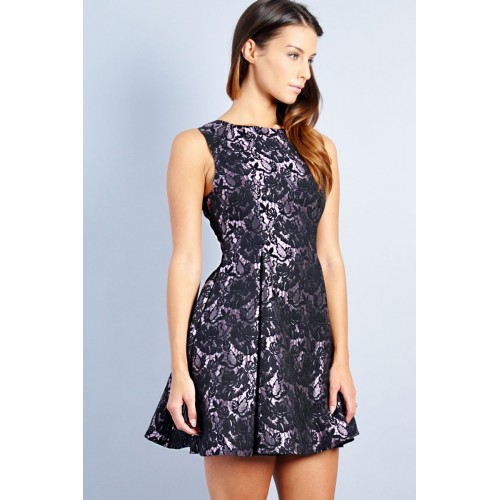 TFNC lace dress with floral motif. Crew cut neckline and pleated skirt with underskirt for volume. Statement zip at back. Care: 64% Polyester, 36% Cotton; Hand Wash Model's height is 5'8'' and she wears a UK size 8 / S