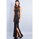 TFNC body con fit floor length maxi with mesh inserts. Side split with boat neckline and stunning low back. Care: 65% Polyester, 30% Polyamide, 5% Elasthanne; Hand Wash Model's height is 5'8 and she wears a UK size 8 / S