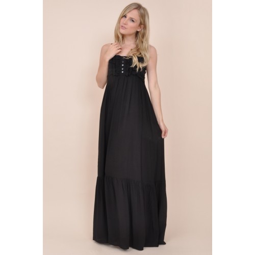 A tiered maxi dress in soft, light material- featuring a ruched bust with ruffle and button detail. Adjustable straps and an elasticated back panel will make sure itâs the perfect fit on any figure. Style it casual with sandals or smarted it up with a blazer and wedges- this maxi is a wardrobe essential. Care: 100% Viscose; Wash at 30 Degrees