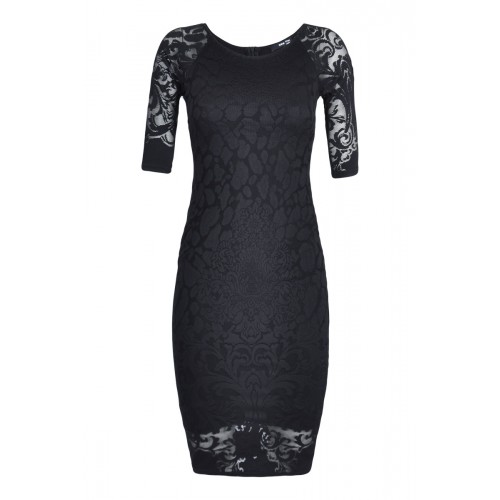 TFNC Evening Dress. - Body-con stretch fit - Midi length - Lace fabric with all over baroque and leopard print motif - 3/4 length sleeves - Round neckline - Concealed zip at the back Care: 65%, 30% Viscose, 5% Elastane. Hand Wash.