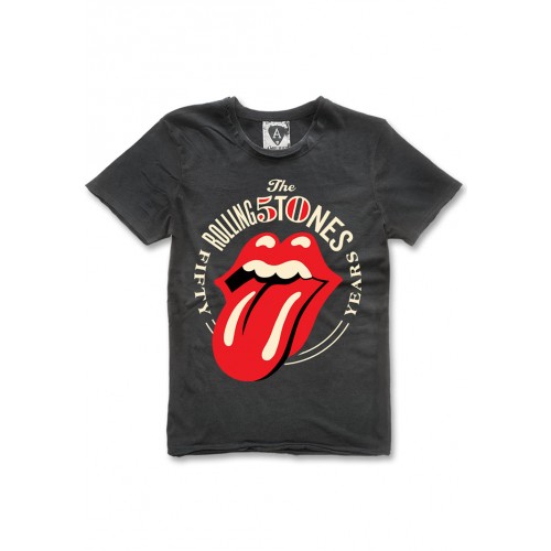 Slim fitting charcoal t shirt featuring a large distressed Rolling Stones 50th print and unique vintage finish. There is a mini ribbed neckline and raw edge detail around the collar, sleeves and bottom hem line. The Amplified emblem is embroidered on the base, reverse of each t-shirt. 100% cotton. Machine Washable at 30 degrees.
