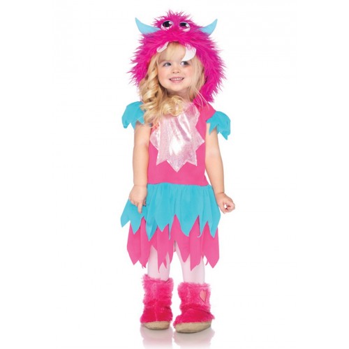 Sweetheart Monster, features dress with layered zig zag skirt and attached furry monster hood ,