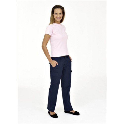 UC905 Uneek Clothing Ladies Cargo Trousers. 2 side & 2 rear pockets with velcro flaps. 2 thigh pockets with velcro flaps. Flat front, Metal Button at waist. Single belt loops reinforced for extra strength, Wide belt loops.