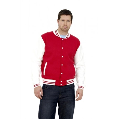 UC525 Uneek Clothing Mens Varsity Jacket. Collared Neckline, Elasticated Ribbed Cuffs & Welt. Fastening Buttons, Long Sleeve, Two Side Pockets.