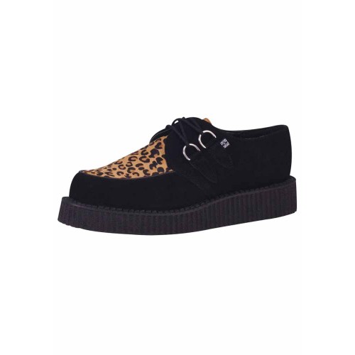 Black suede original creepers with leopard print cow hair upper. This design features a 2cm tall super strong Mondo Lo rubber soleandtraditional 2 D-Ring lace-up.They are unisex and look great on guys or girls, womenare advised to purchase a size smaller than usual. Ispired by the underground T.U.K create classic Rock n Roll footwear, favoured by celebrities and public alike.