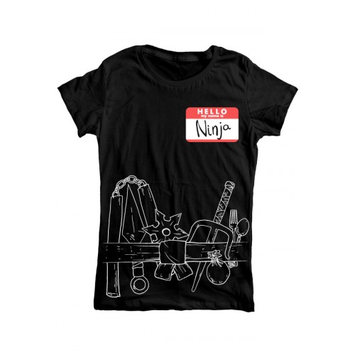Goodie Two Sleeves short sleeved black tee. This design features a round neckline and Ninja weapon belt design and Hello my name is soft print. This is a slim fitting design. 100% Cotton Machine Washable at 30 degrees