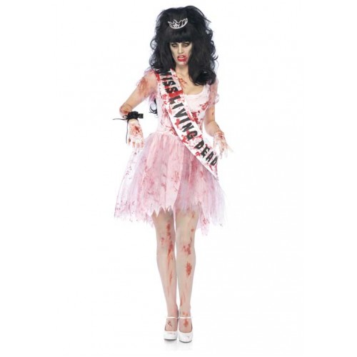3 PC. Putrid Prom Queen, includes bloody tattered prom dress, Miss Living Dead sash and zombie crown.,